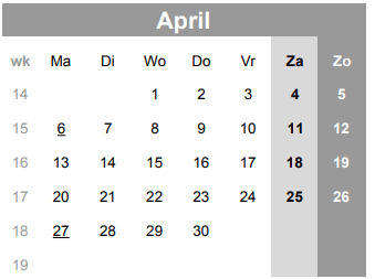 - dinsdagavondrit: 01/04 - 08/04 - 15/04 start 18.30 u en vanaf 22/04 start 19.00 u - samenkomst aan het clublokaal. GPX korte route. GPX lange route. GPX C rijders.